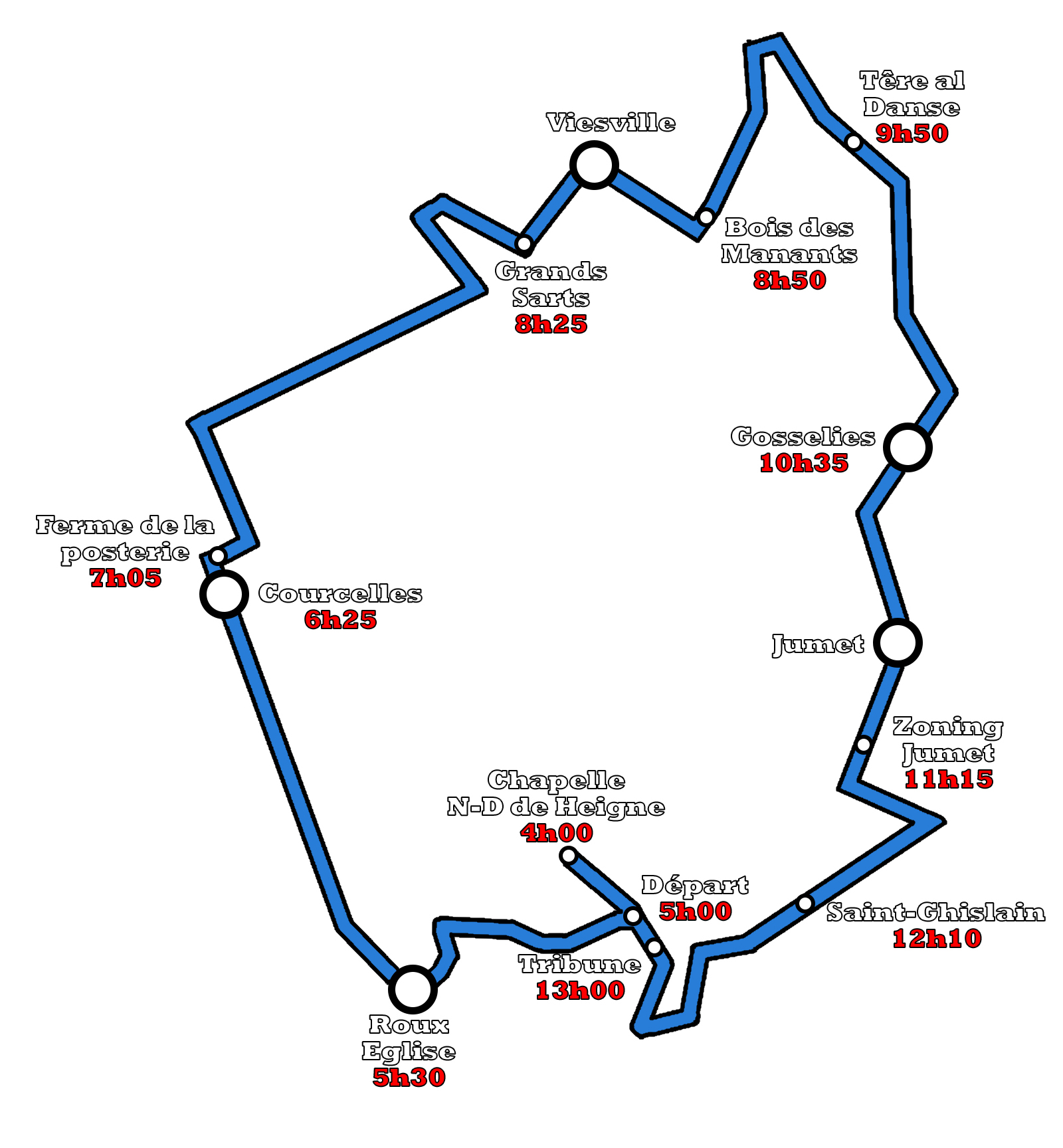 La journée démarre dès 4 heures du matin par la messe des pèlerins. Le Tour prend son départ à 5 heures pour un périple de 22 km à travers plusieurs communes au nord ouest de Charleroi.